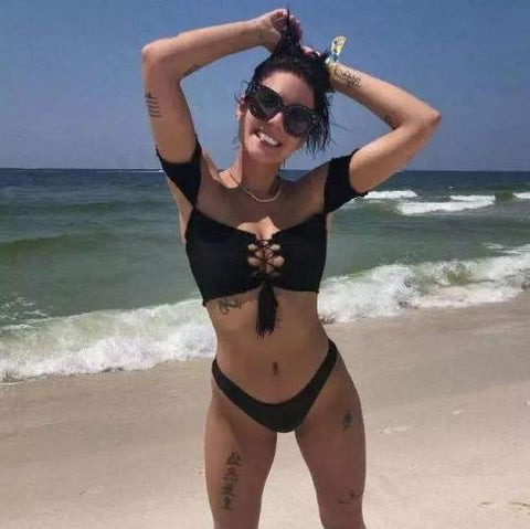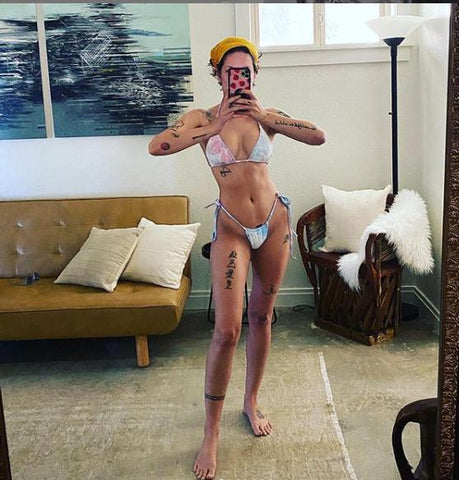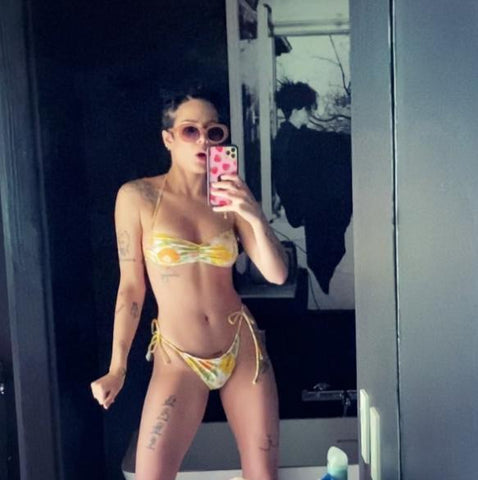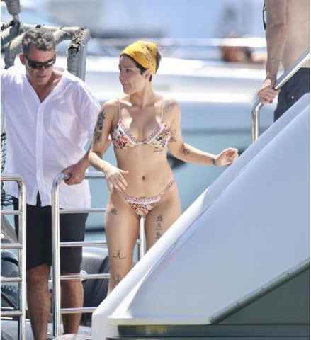 Halsey is definitely a sweet presence.Her style of long hair is quite different from that of short hair.She is a typical singer with a sweet face, but her style is definitely not sweet and cute, full of boldness and wildness.She loves colourful bikinis,but also vintage.There is one more thing in common among Halsey's bikinis: the triangle bikini.Maybe that's her style.
