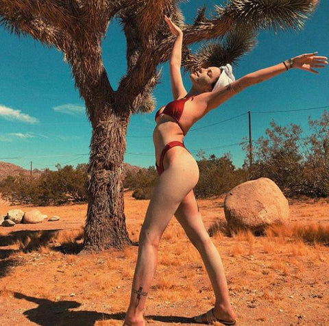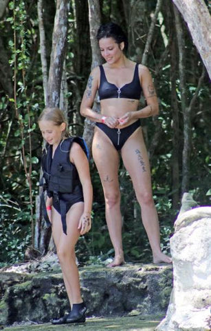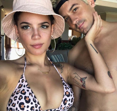 A simple bikini may not attract people’s attention.At this point, we need to put on our accessories.A headscarf, sunshade, sunglasses or even headphones can add to your look.A pair of earrings and a necklace can also make you look cooler.It depends on your choice.As for Halsey,her tattoos have also become a feature of her bikini look.