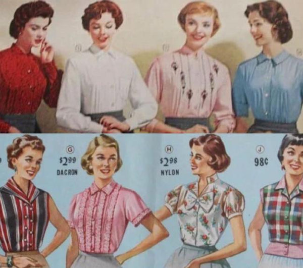 In the 1940s women's blouses were mostly white or ivory.Entered 50 time, rich colour just is individual character style.Women's flounced tops or lace tops were gradually being replaced by men's button-down shirts.This is because button-down shirts can reoutline a woman's body shape, bringing a more casual yet elegant visual effect.
