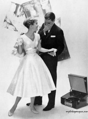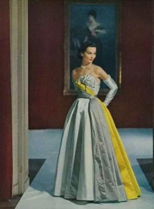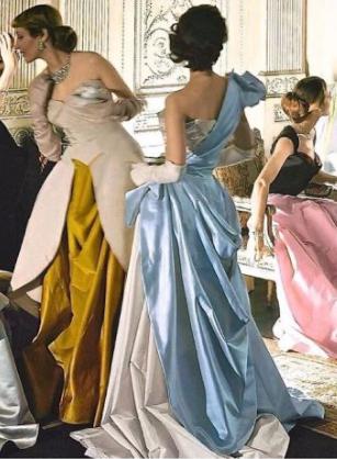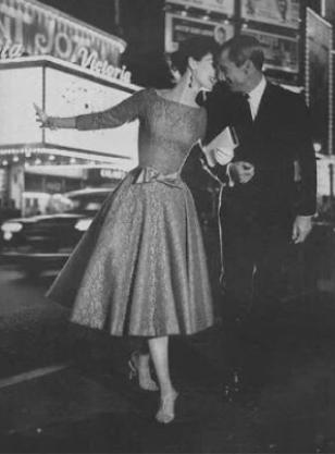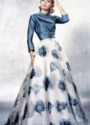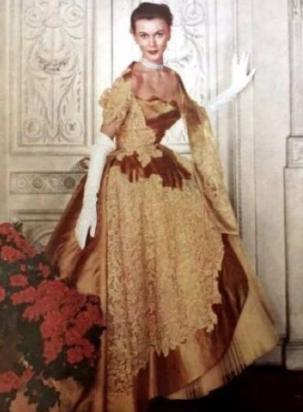 The gowns of the 1950s were based on Victorian silhouettes,tulle, silk, lace and other materials combined with embroidery, beads and other techniques to create the dress .The most iconic dress of the 1950s was the cocktail dress.The dress is typically relatively bare at the shoulders and chest, with a V-shaped or heart-shaped neckline.The skirt is either an A or An H, and reaches calf length.