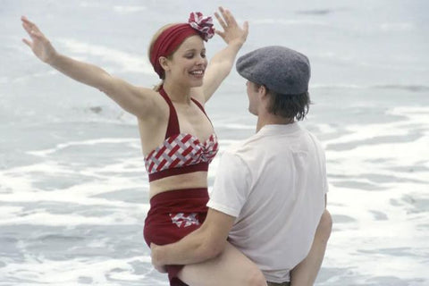 The Notebook is a 2004 romantic drama film directed by Nick Kasavitz.It is adapted from the novel of the same name by American novelist Nicholas Sparks.The movie tells the story of two childhood friends reunited after world War II.And it narrates in the way of memory, driving the emotions of the audience back to the day when they met and were reunited.In the movie, Allie, in a red plaid bikini with matching headbands, laughs and hugs Noah in the waves.What a sweet image!