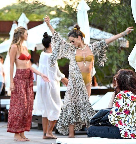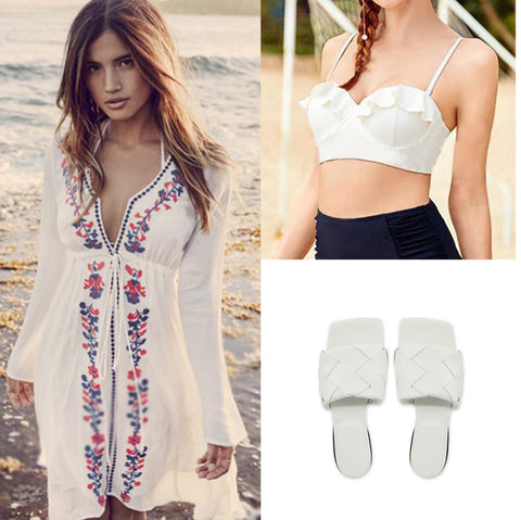 We can take Olivia Culpo as an example,A plain white bikini with a white coat,Although it loos simple,gives the impression of comfortable.So if you like this style,you can choose a black and white bikini with a white patterned coat.As for slipper,bright or plain is both OK.