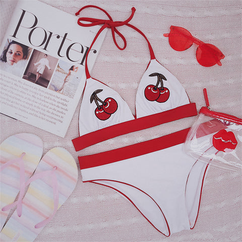 Cherry bikini, giving a sweet and lovely feeling, but also very fashionable.White is fresh, red adds vigor.Cherry embroidery on the chest that reminds people of the warmth of spring and the enthusiasm of summer.