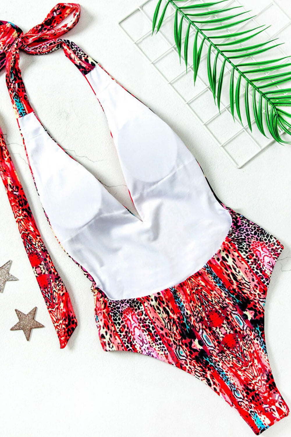COLORFUL CHEETAH HALTER DEEP V HIGH LEG ONE PIECE SWIMSUIT