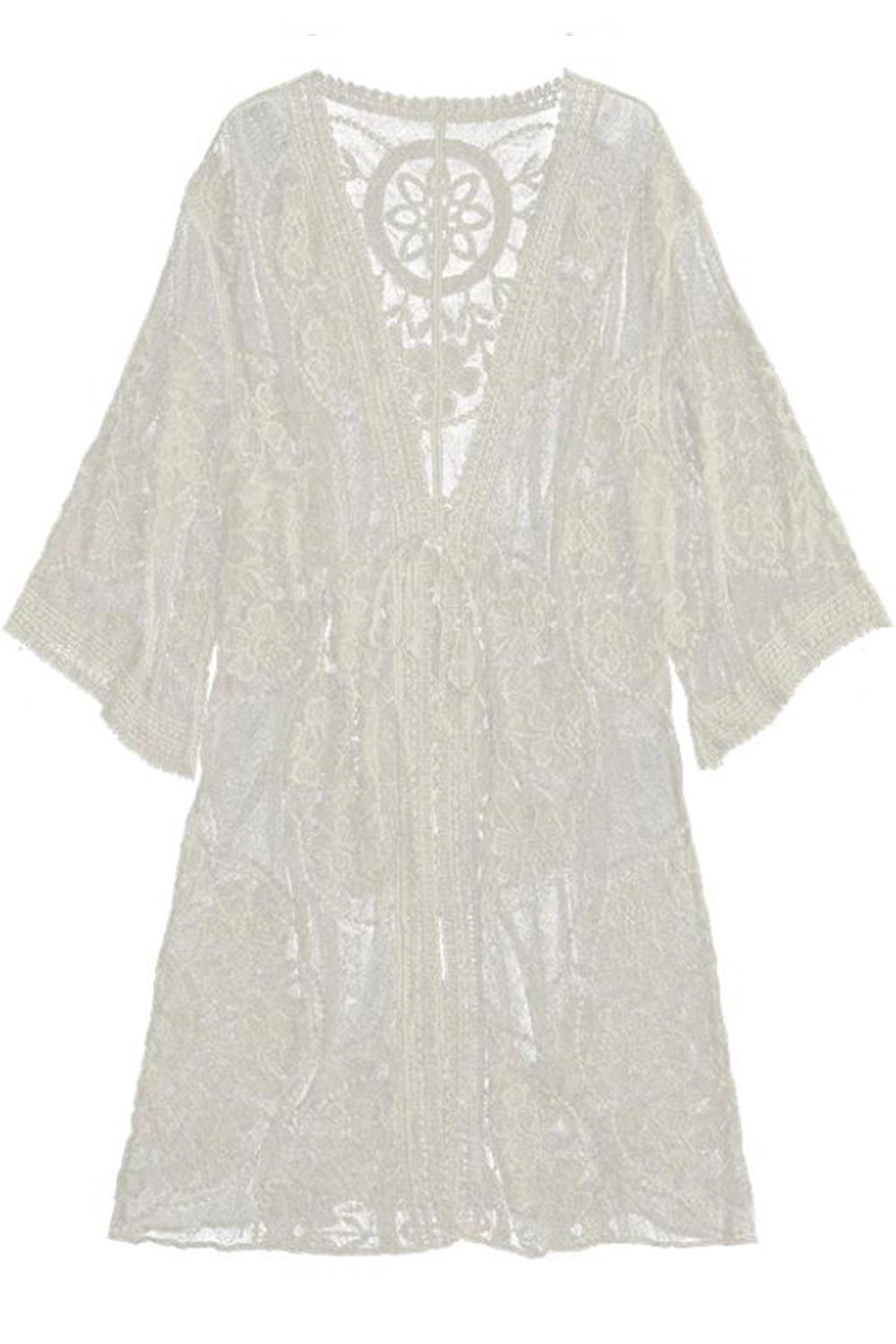 A tie front embroidered beach coverup featuring wide sleeves and a midi length.