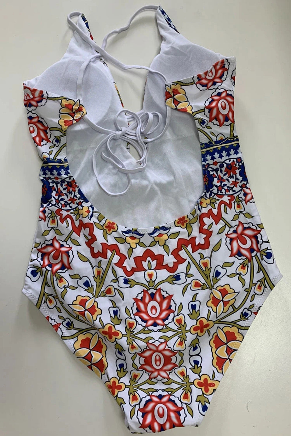 Bohemian one piece Swimsuit features plunged v neckline with adjustable spaghetti straps, detachable cups, low scoop back with lace up straps, and high cut leg bottom in skimpy back coverage. Allover in ethnic printed.