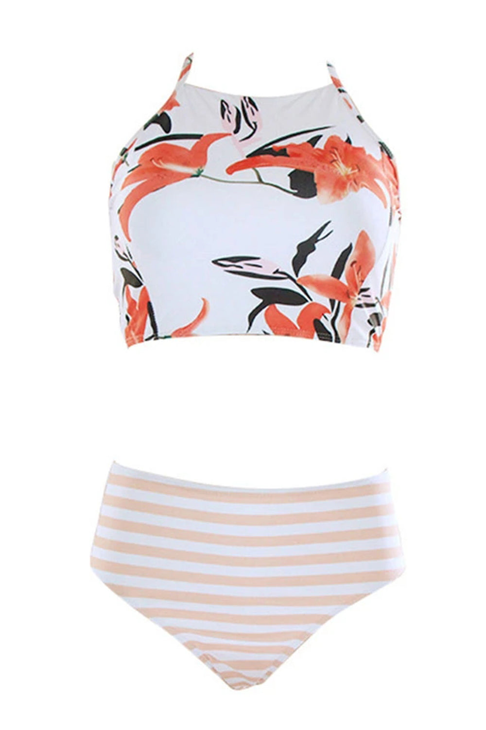 Tropical two piece bikini set featuring a midikini top with high neckline, switchback with lace up straps back, removable cups, floral print, and a pair of mid rise bikini bottom in cheeky coverage and stripe print.