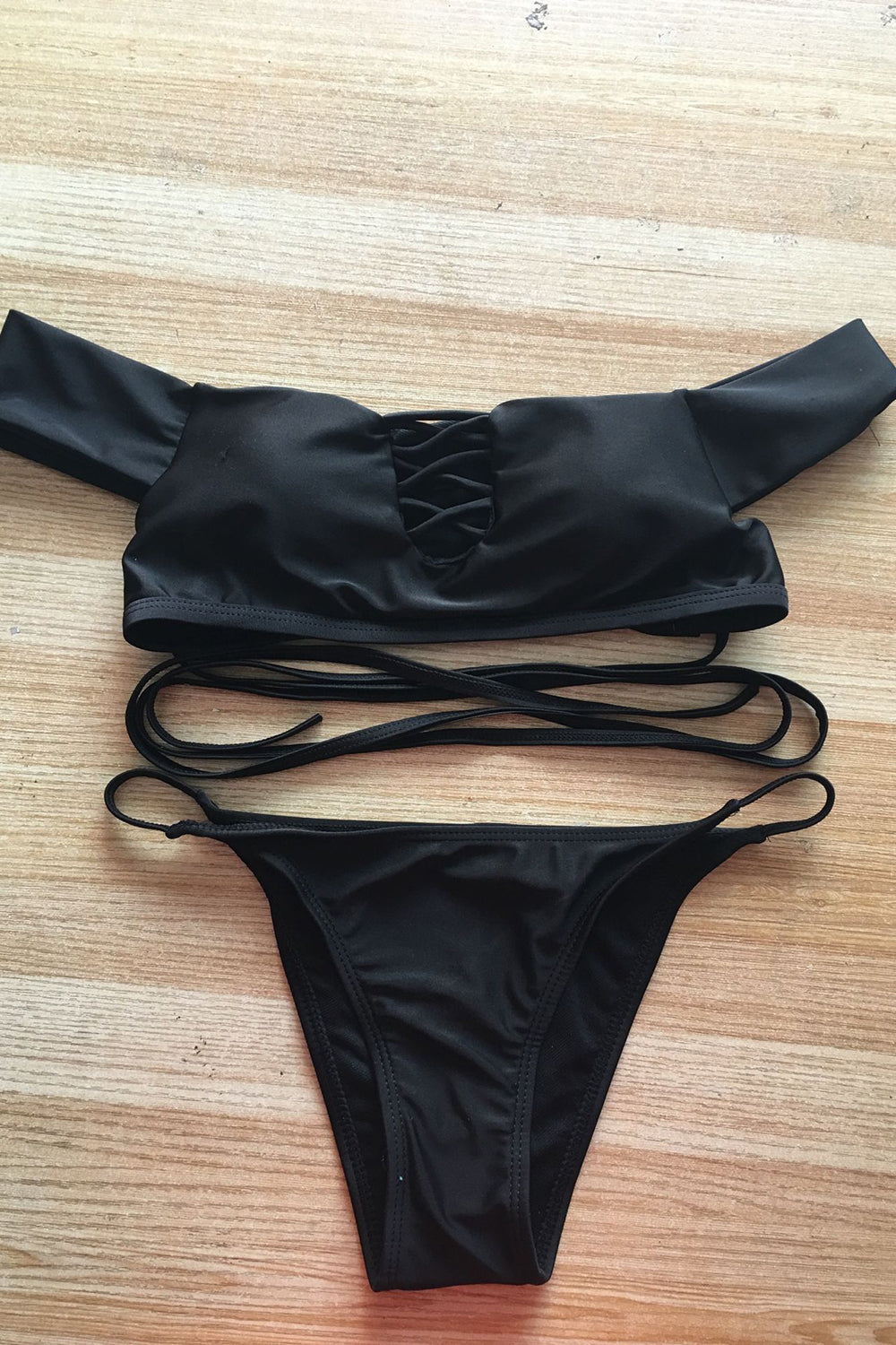Iyasson Black Off-the-shoulder Strappy Bikini Sets