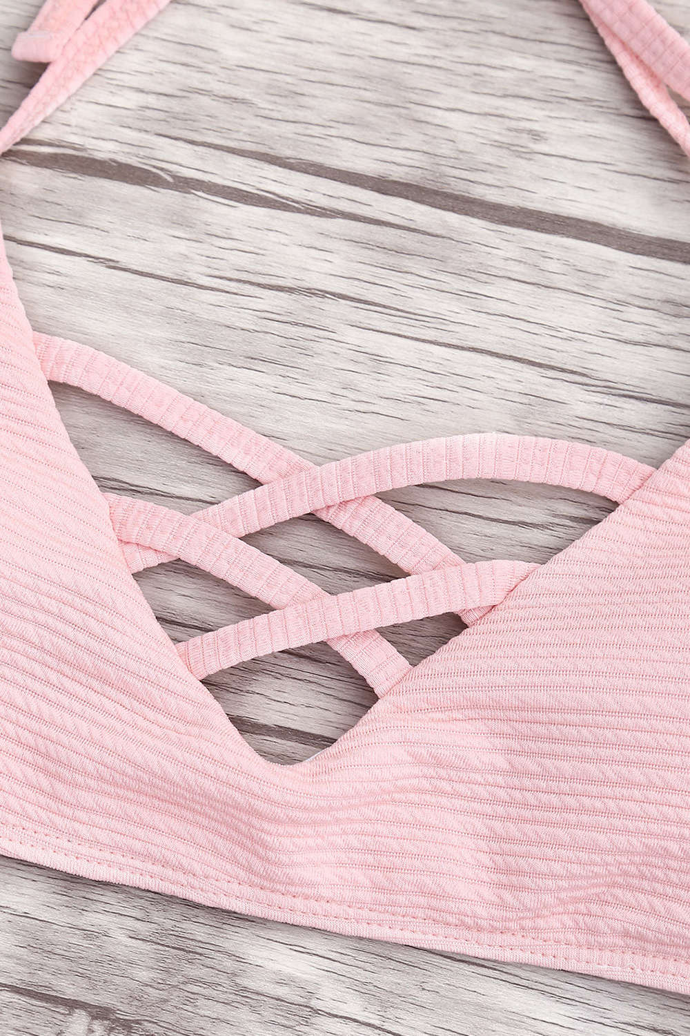 Iyasson Creamy Pink Cross Design Halter Bikini Swimwear