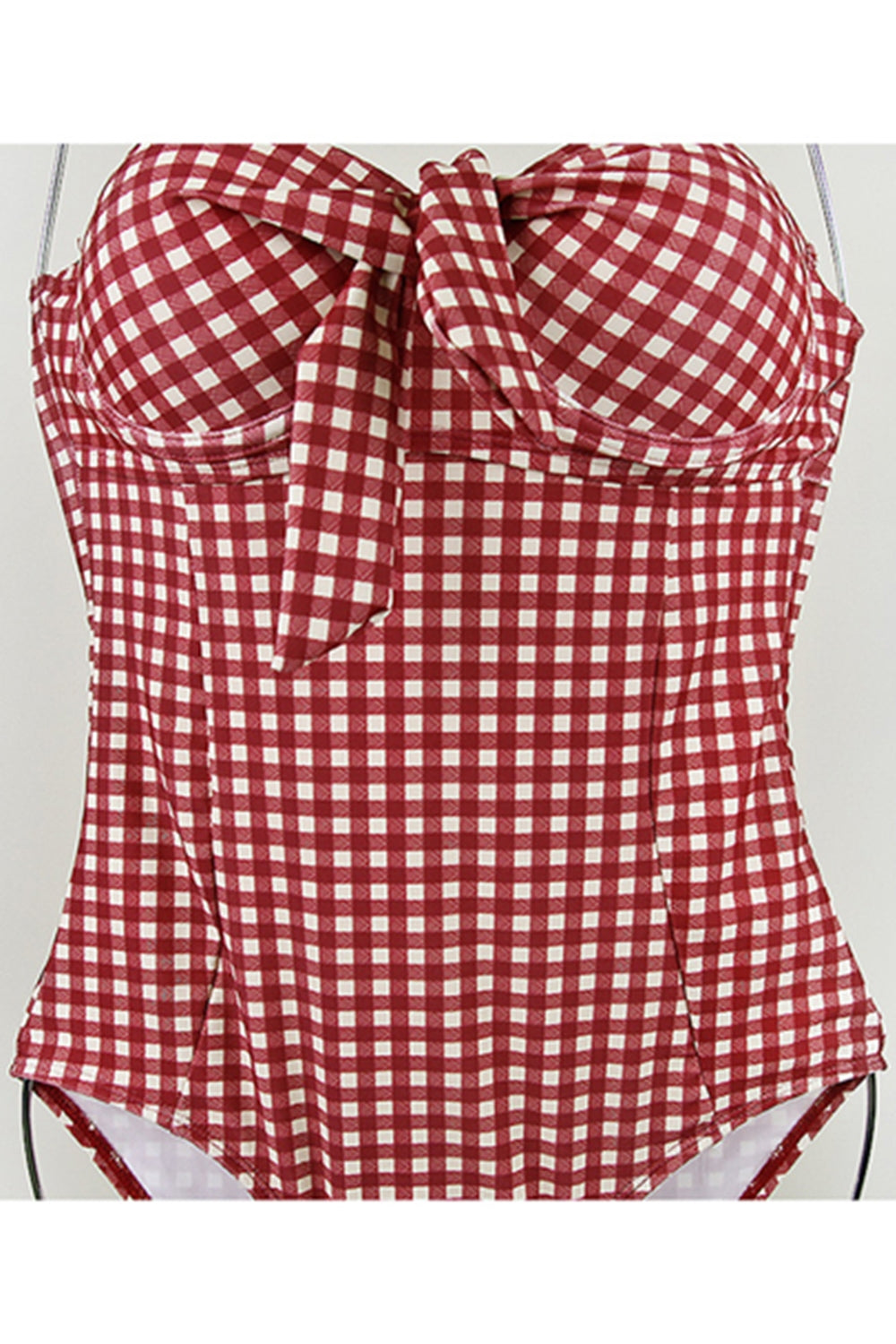 Iyasson Red Plaid Vintage Girl One Piece Swimsuit