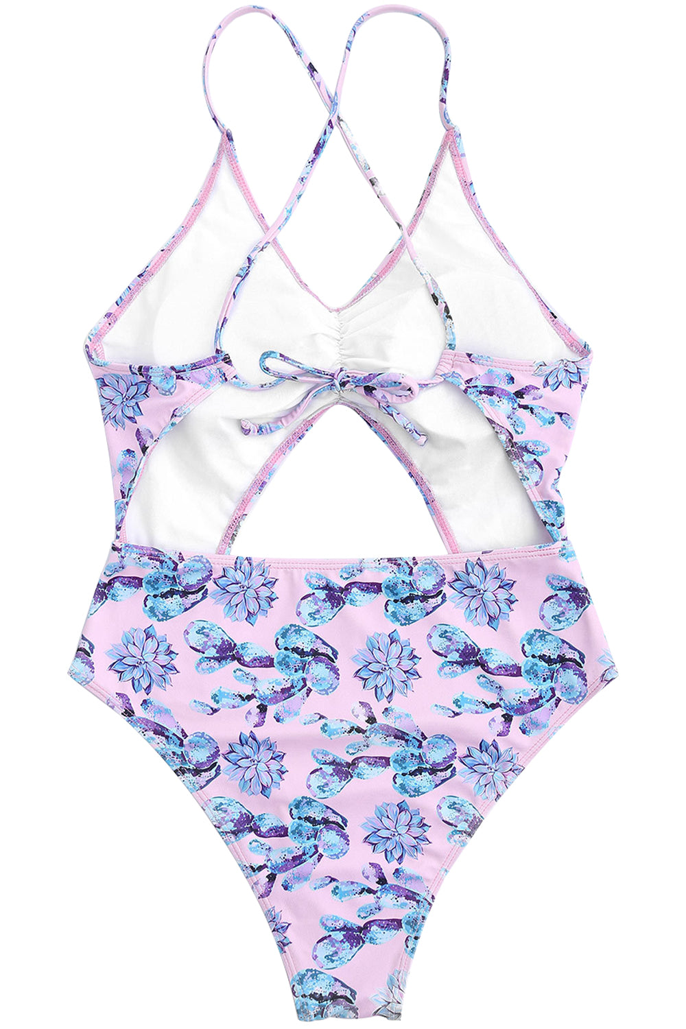 Iyasson Purple Flowers Printing Halter One-piece Swimsuit