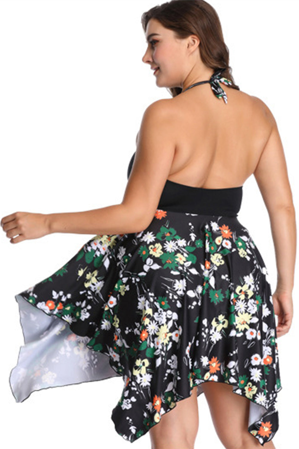 -Dress style bikini top with Floral print and Ruffle trim at front, the Irregular floral hem with High elasticity, Without steel support, High waist solid color boxer shorts.