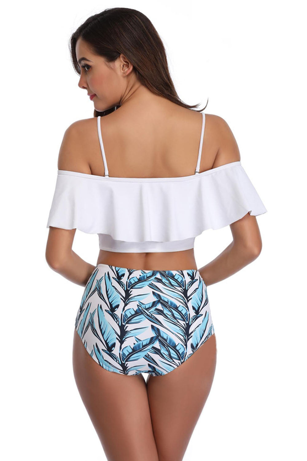 -Pattern: Breathable Printed Ruffled Spaghetti Strap High Waist Quick Dry Bikini Set.