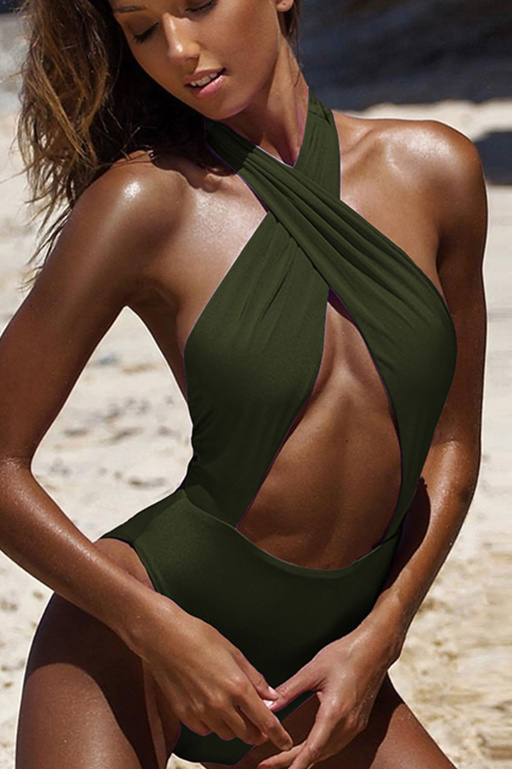 -Solid Color Front Cross Hollow Backless Neck Strap Halter Swimsuit.