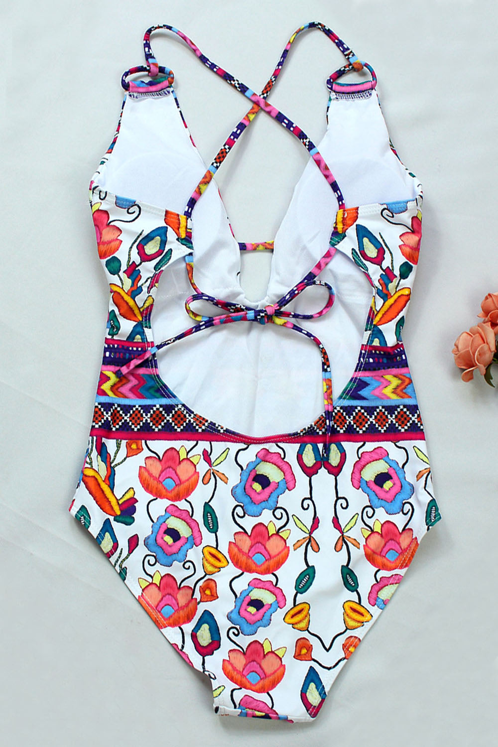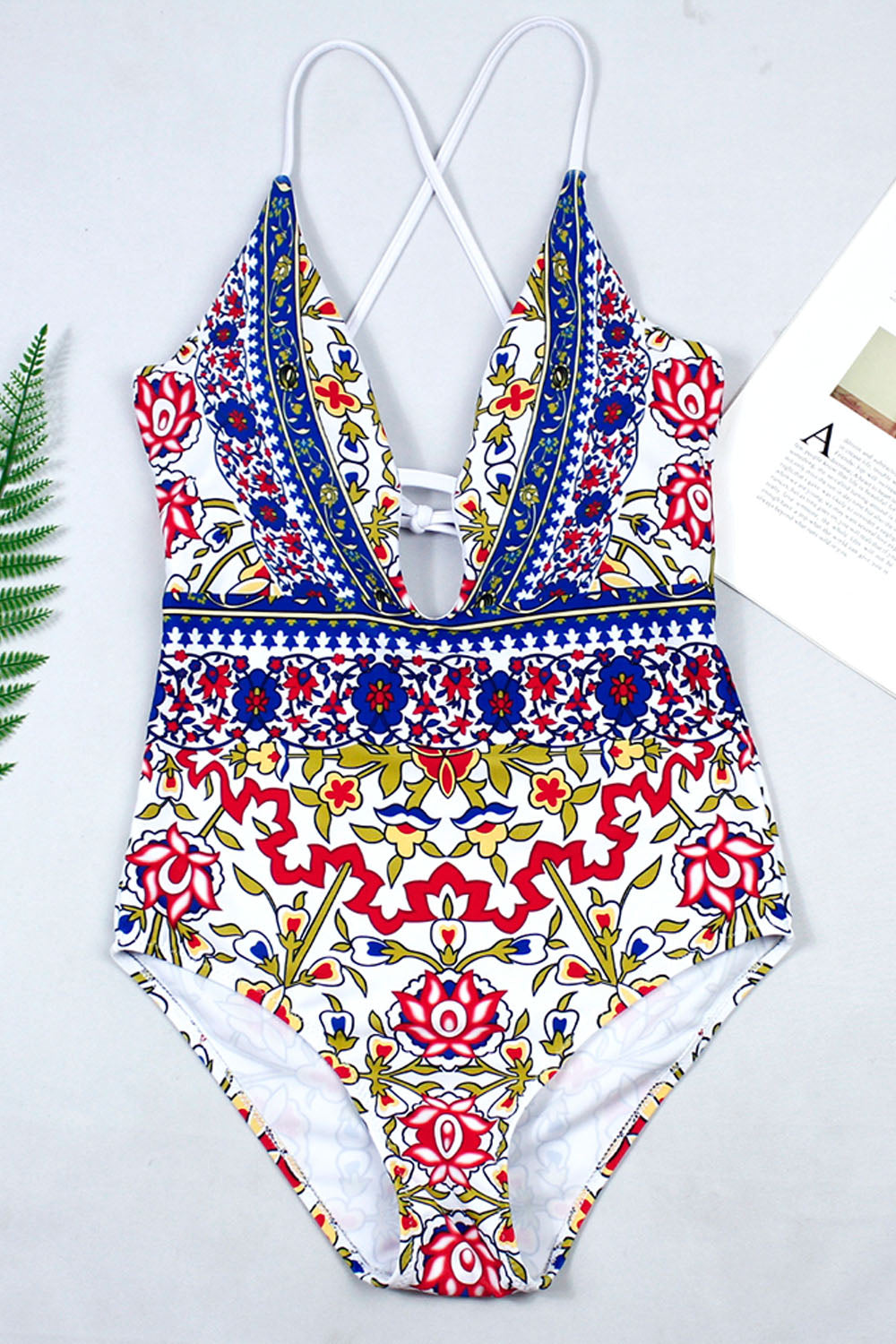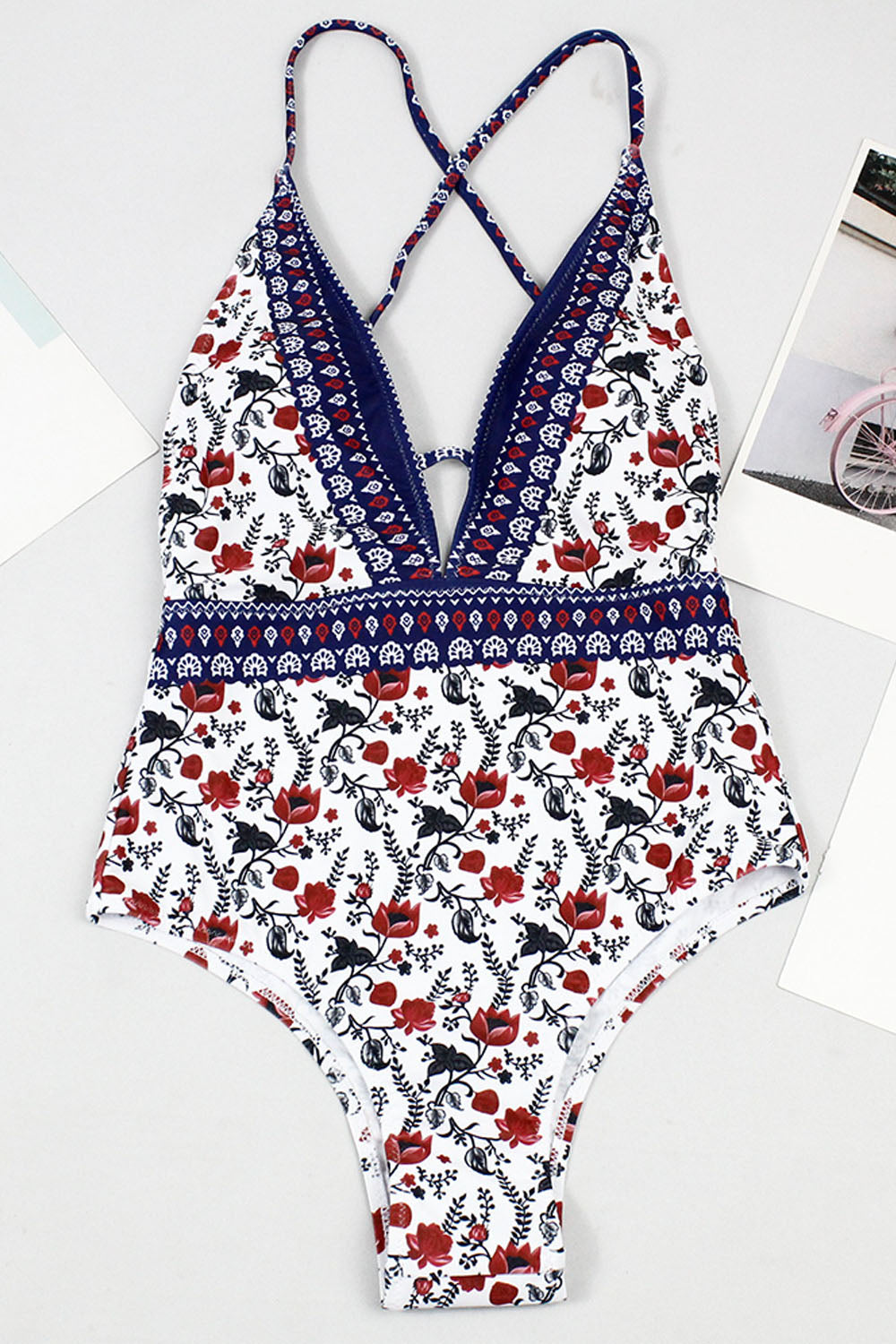 -One-piece women's swimsuit, chic ethnic print and sexy low-cut & back cross design.
