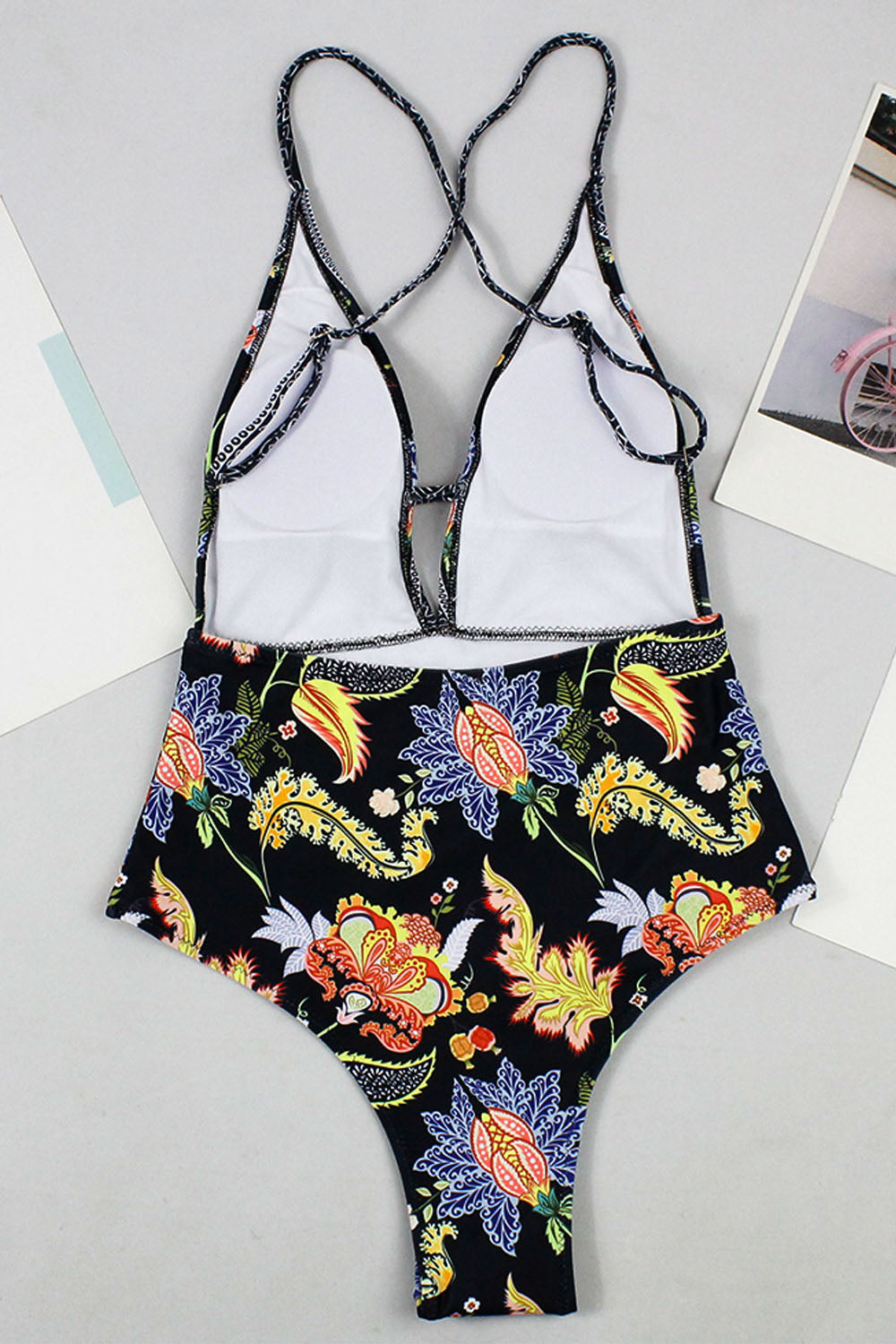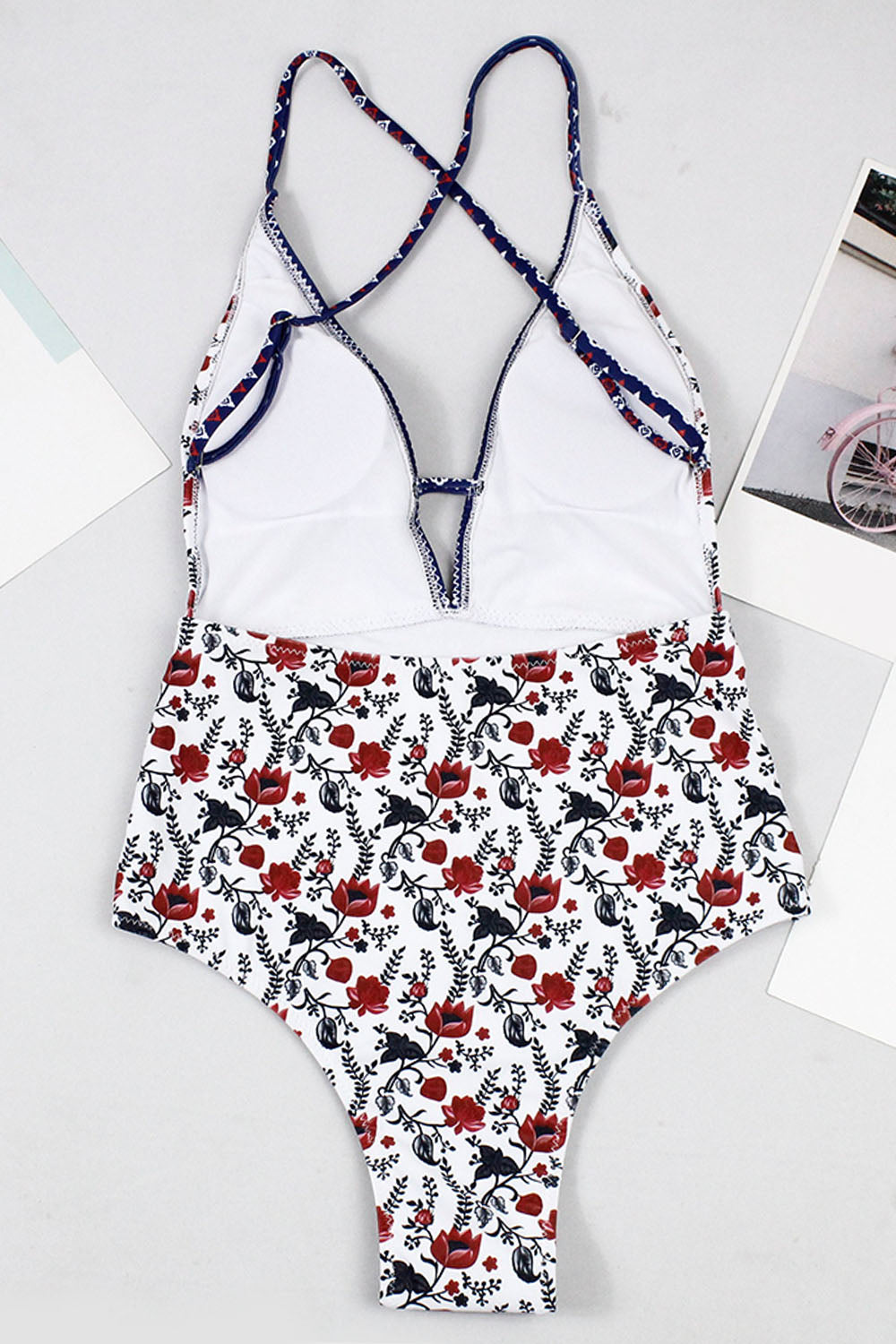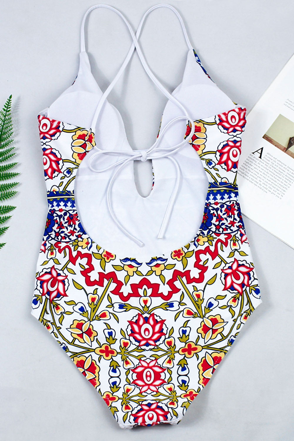 -One-piece women's swimsuit, chic ethnic print and sexy low-cut & back cross design.
