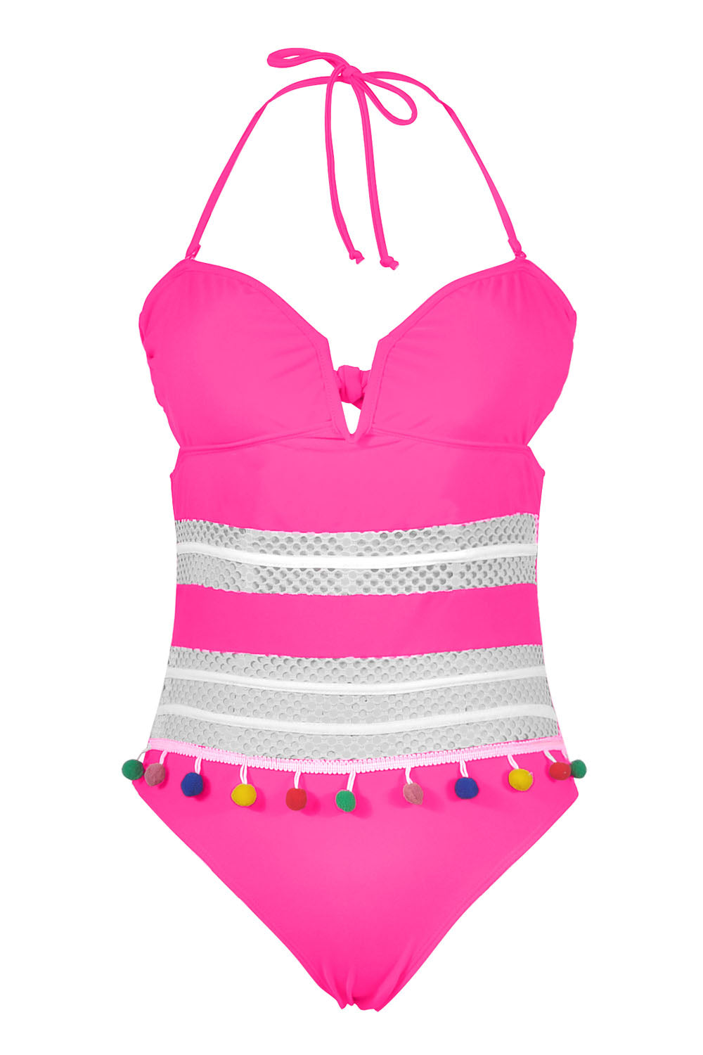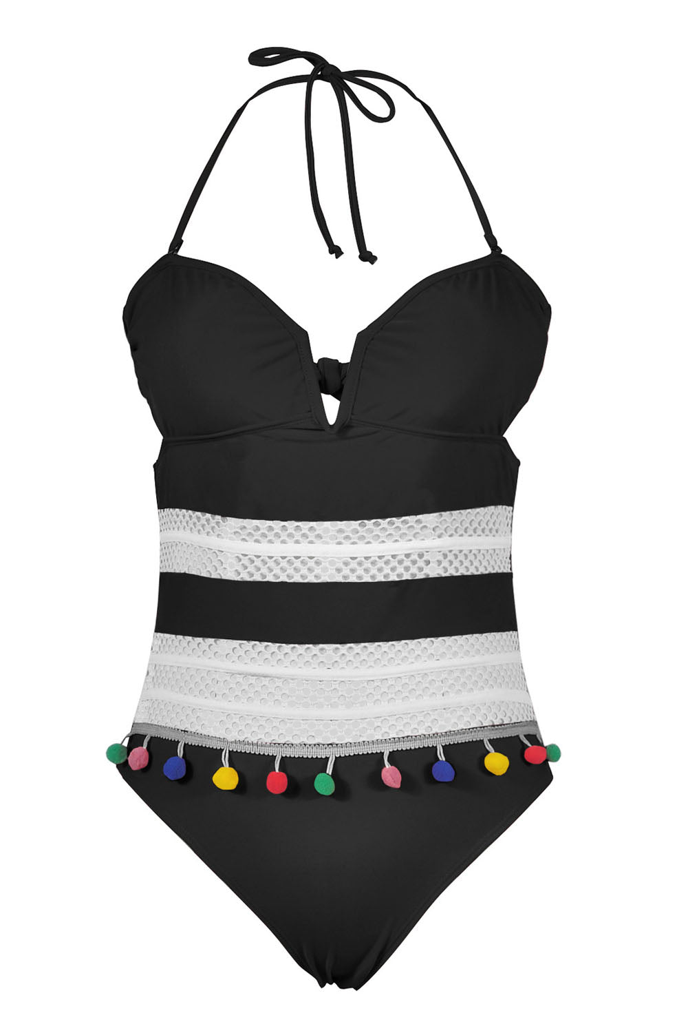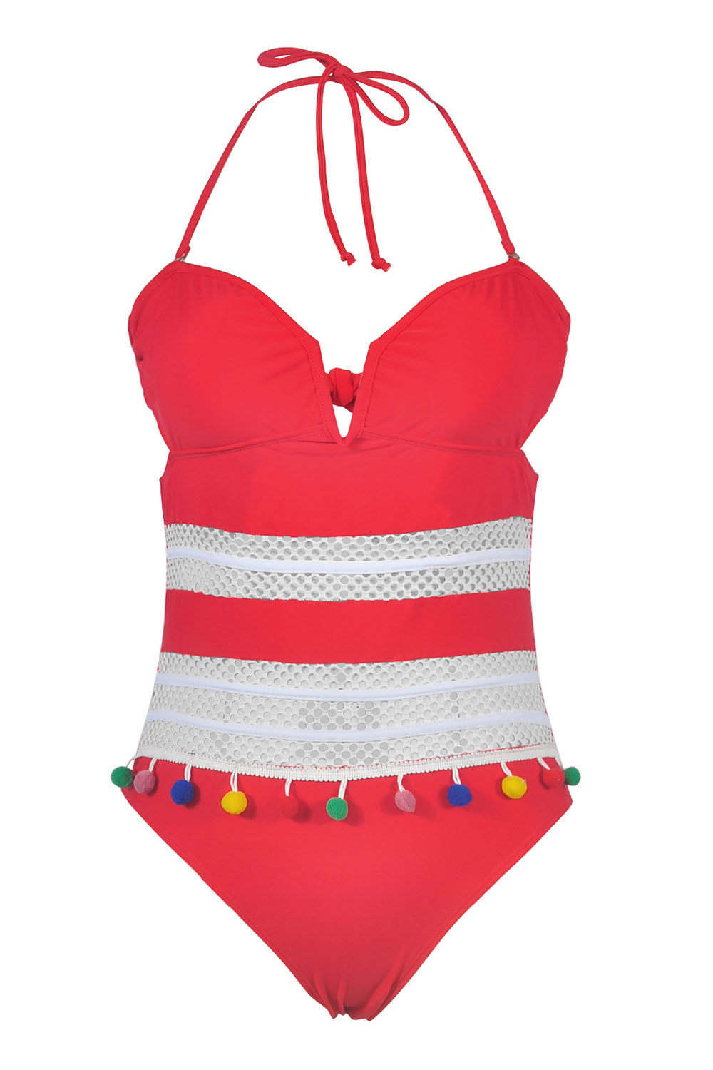 -One-piece women's swimsuit, breathable mesh and colorful ball tassel design.
