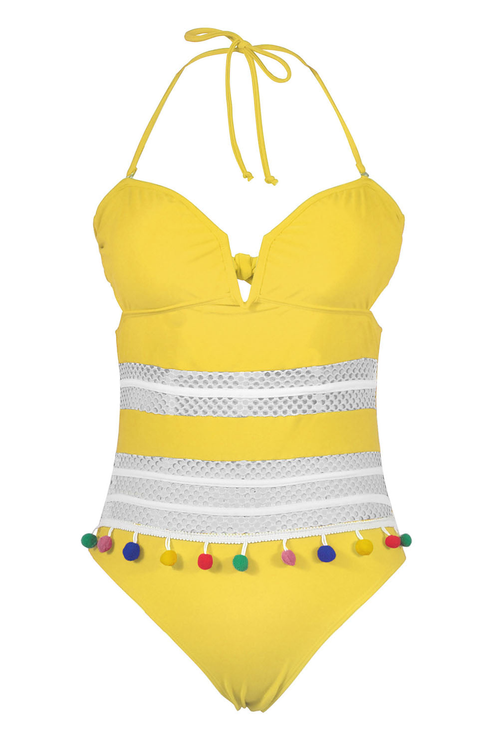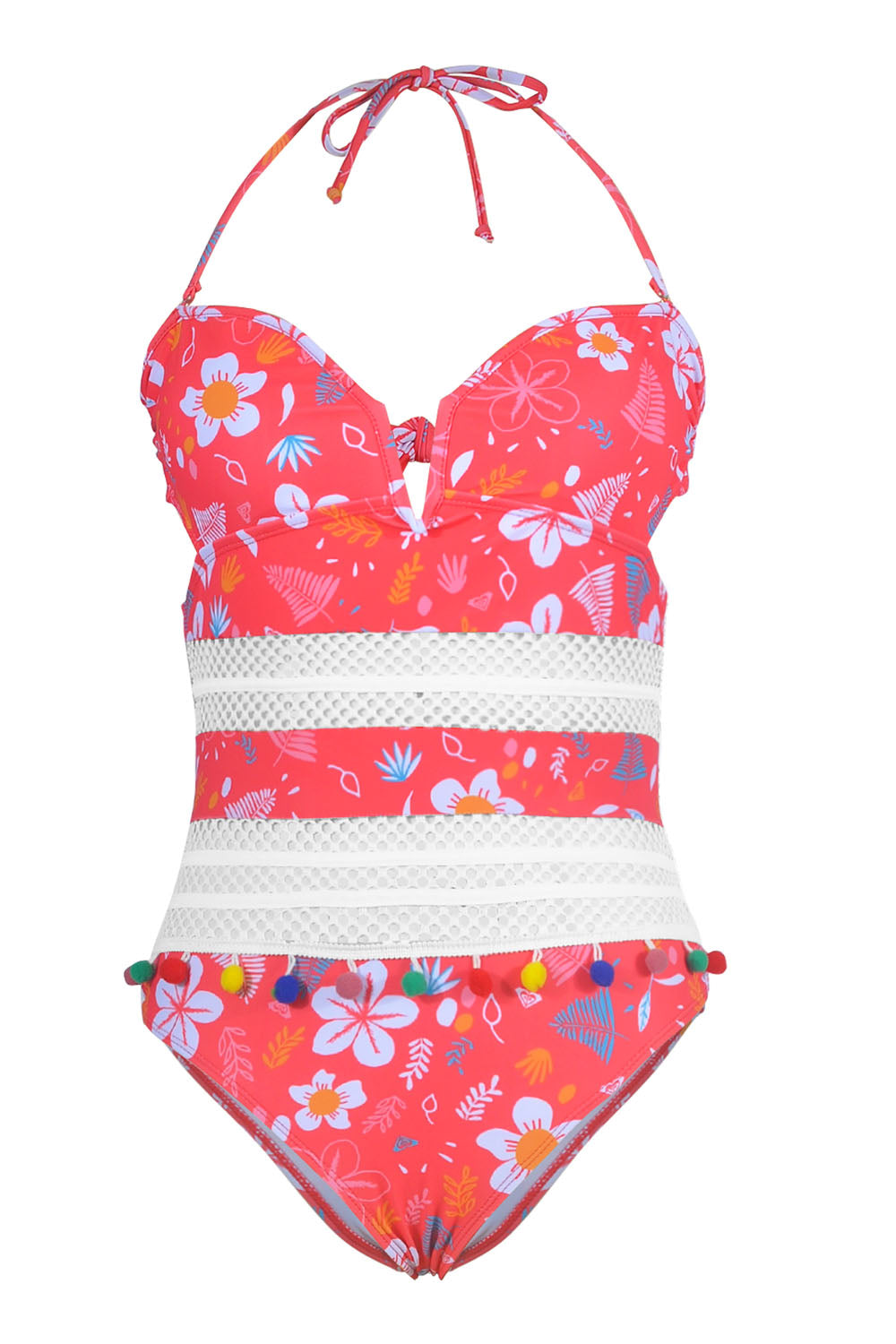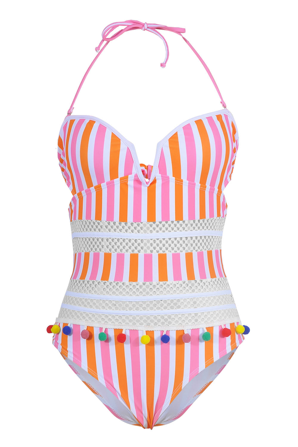 -One-piece women's swimsuit, breathable mesh and colorful ball tassel design.