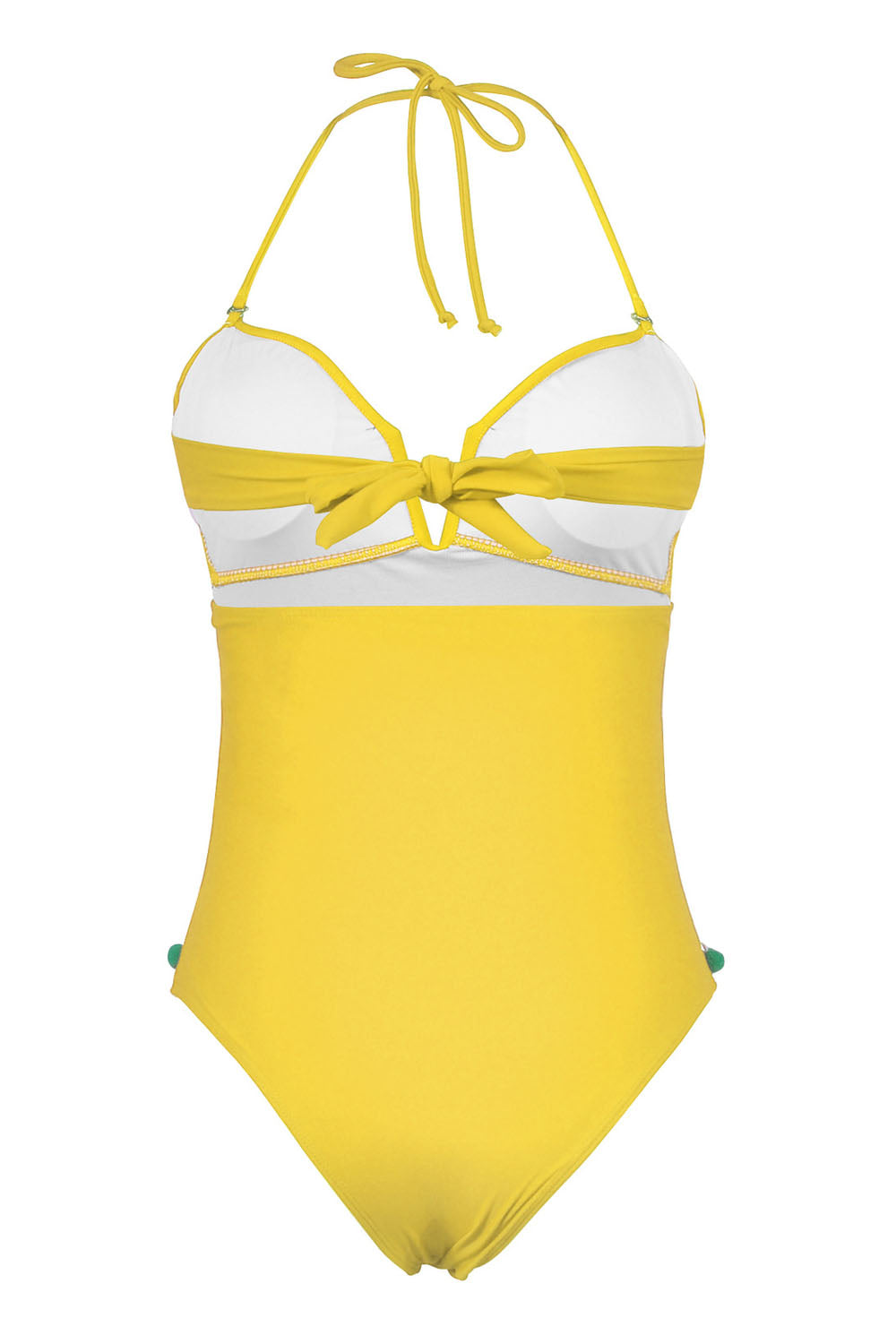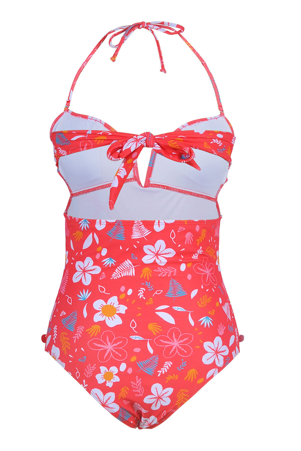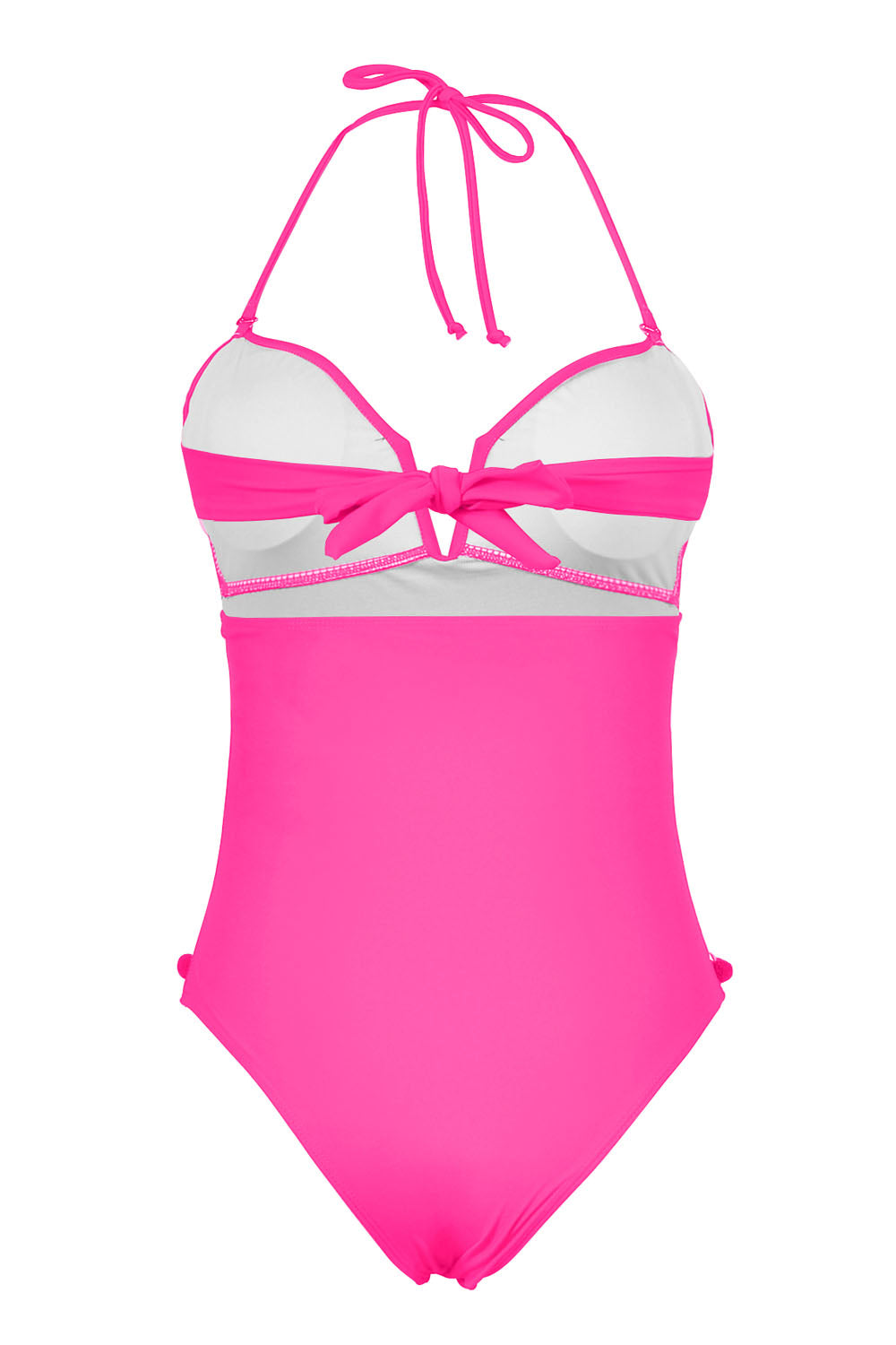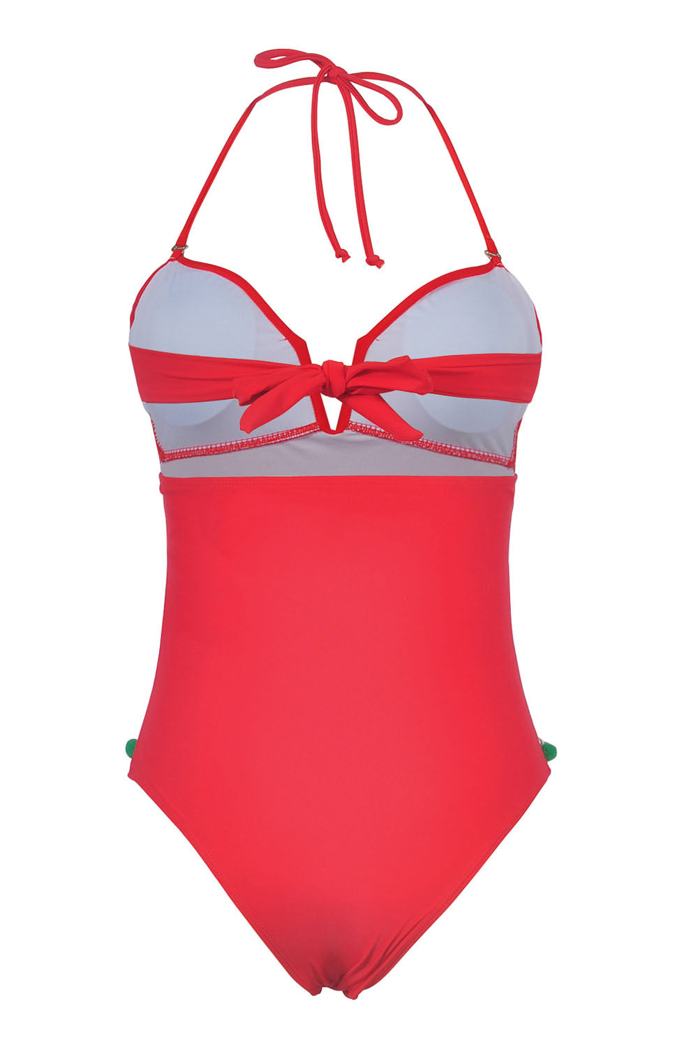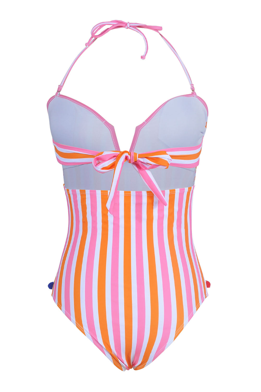 -One-piece swimsuit with Ball tassel and Mesh stitching at front, Adjustable strap at neck and back, With chest pad without steel support, High waist cut triangle bottom.