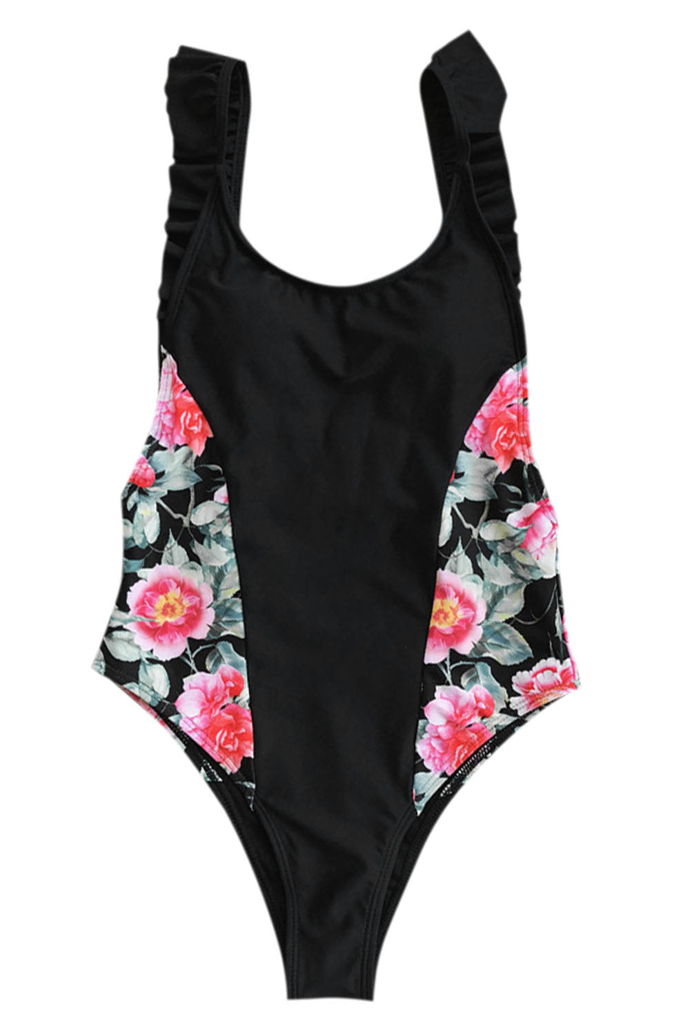 -One-piece swimsuit with ruffle trim at adjustable shoulder straps, Two ties at back and backless, With non-removable chest pad, High waist triangle bottom.