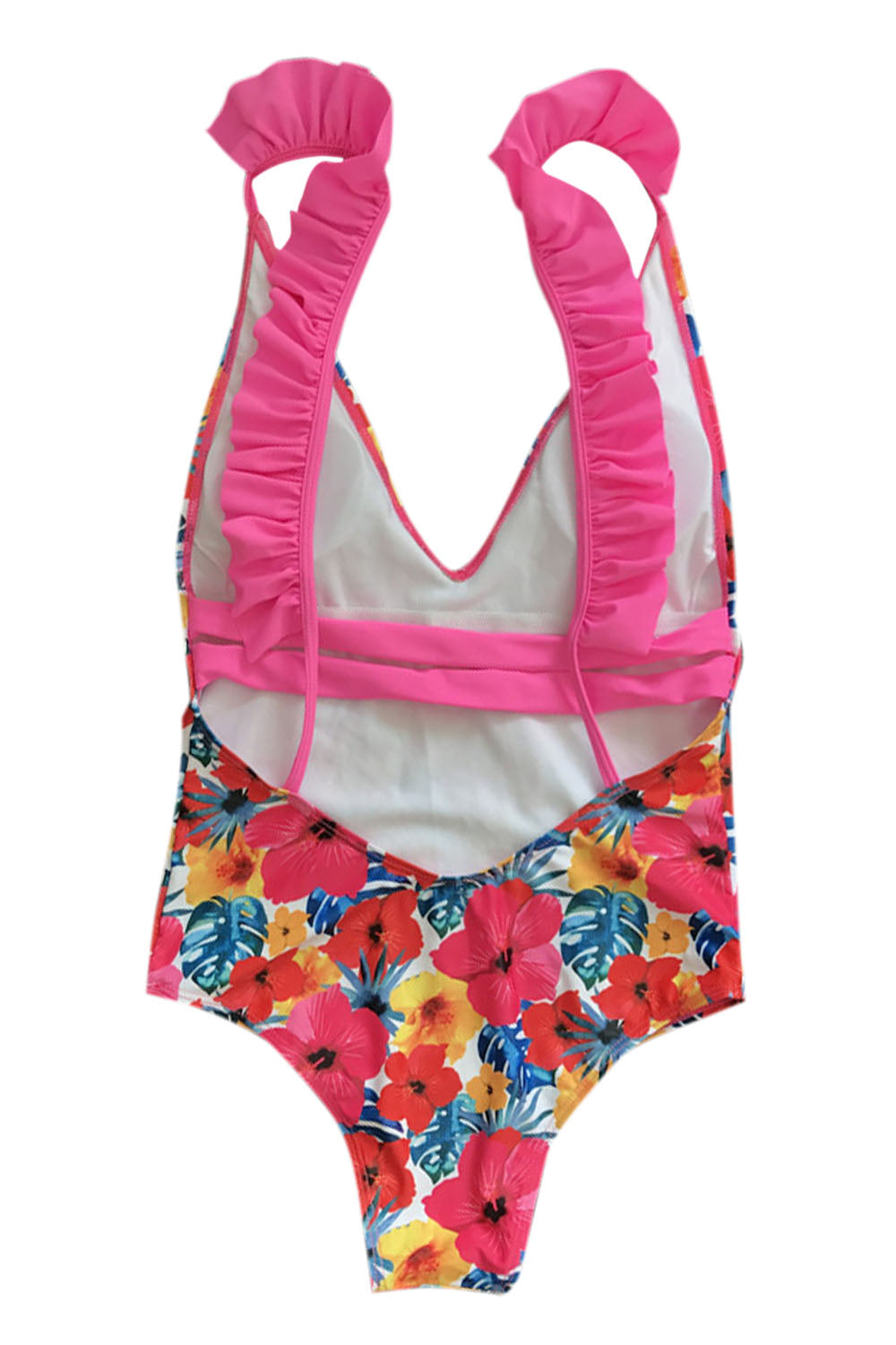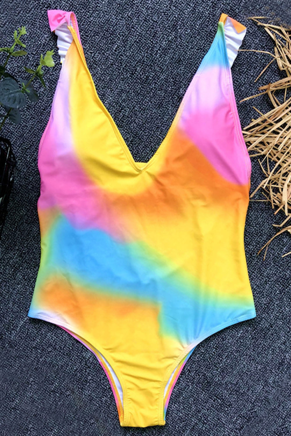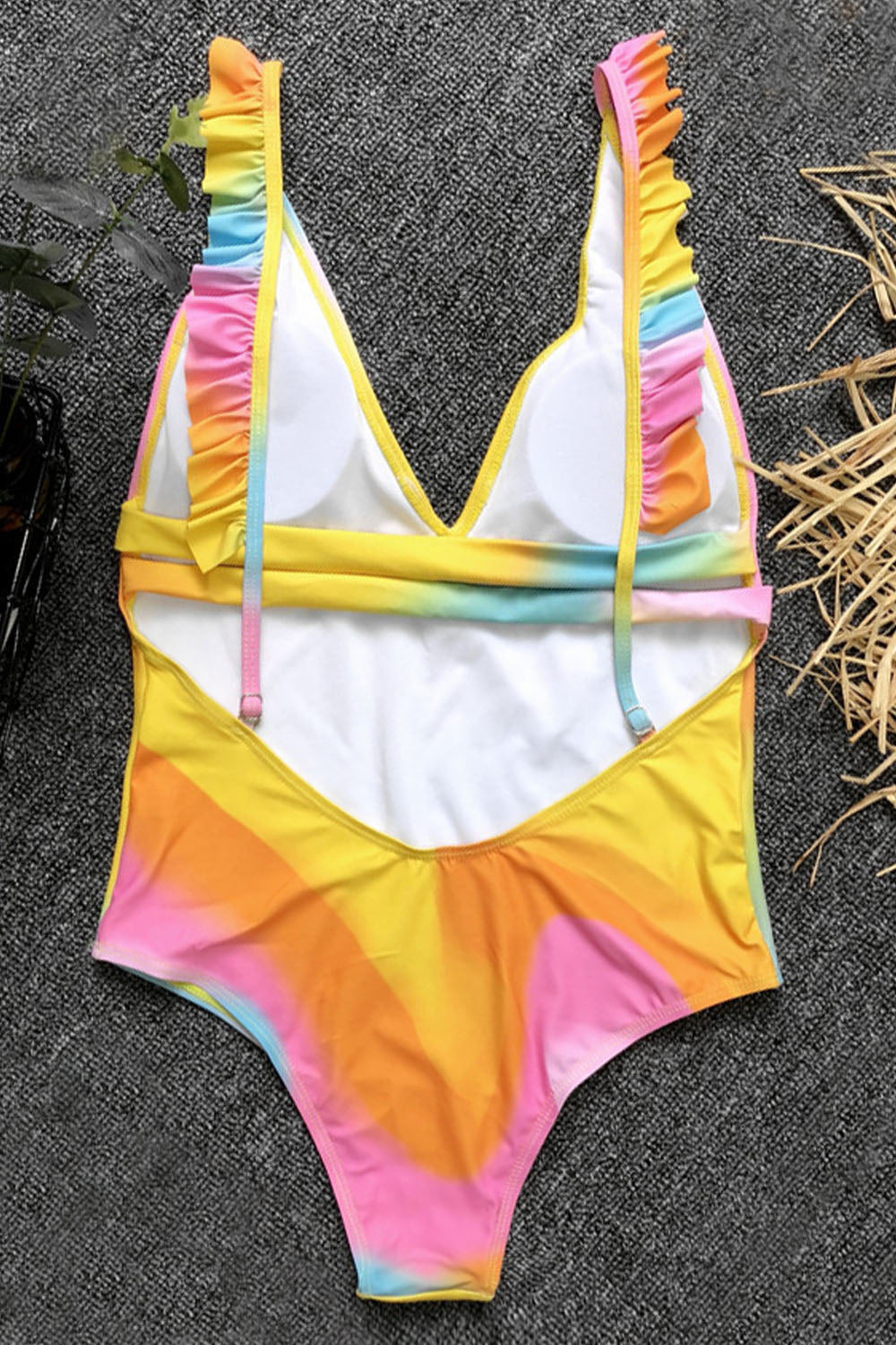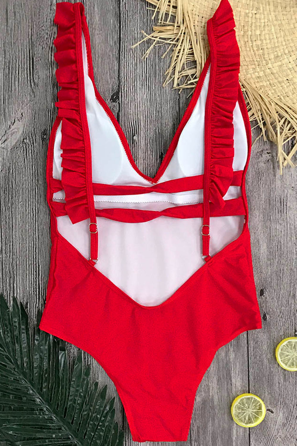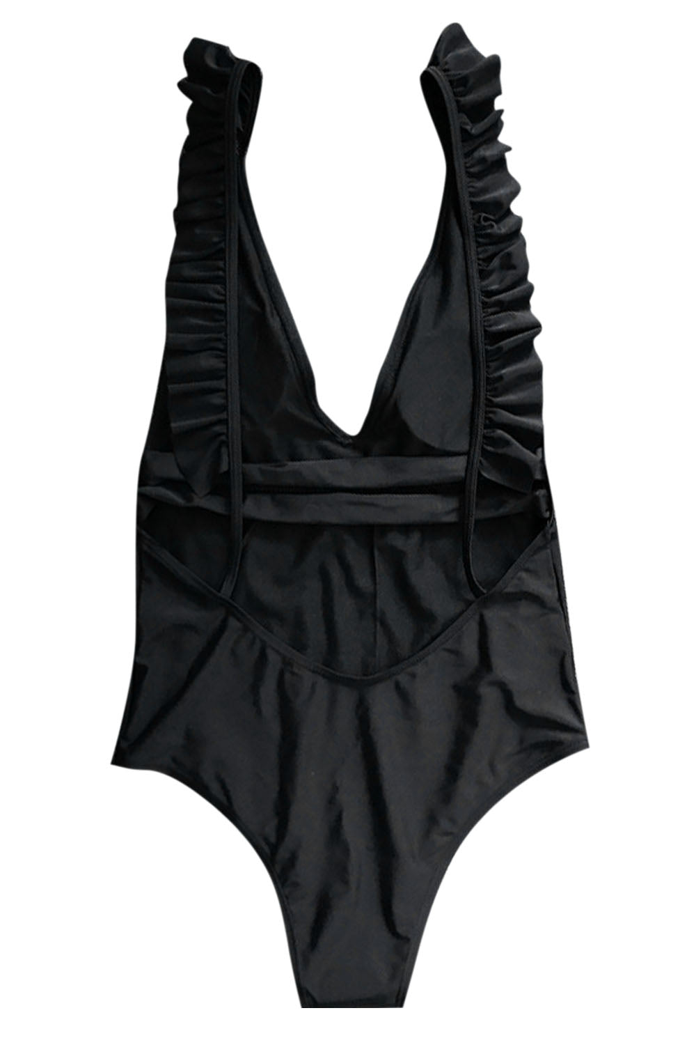 -Deep V-Neck Solid Color Printed Shoulder Strap Ruffle Trim Back Ties Swimsuit.