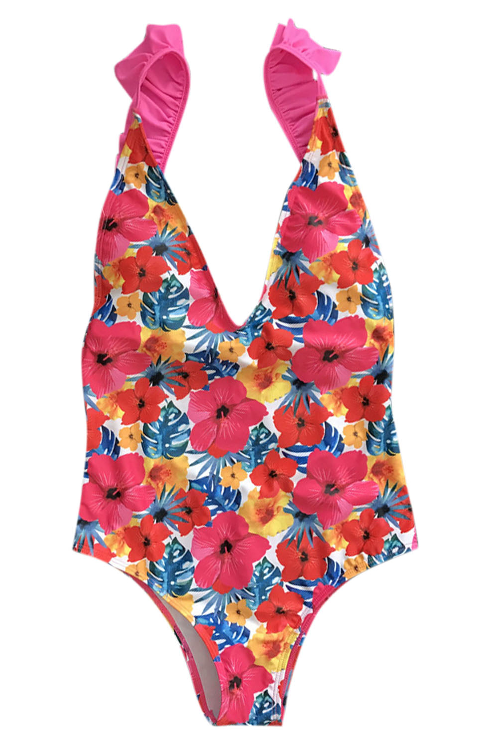 -One-piece women's swimsuit, sexy deep v neck and cute strap ruffle trim design.