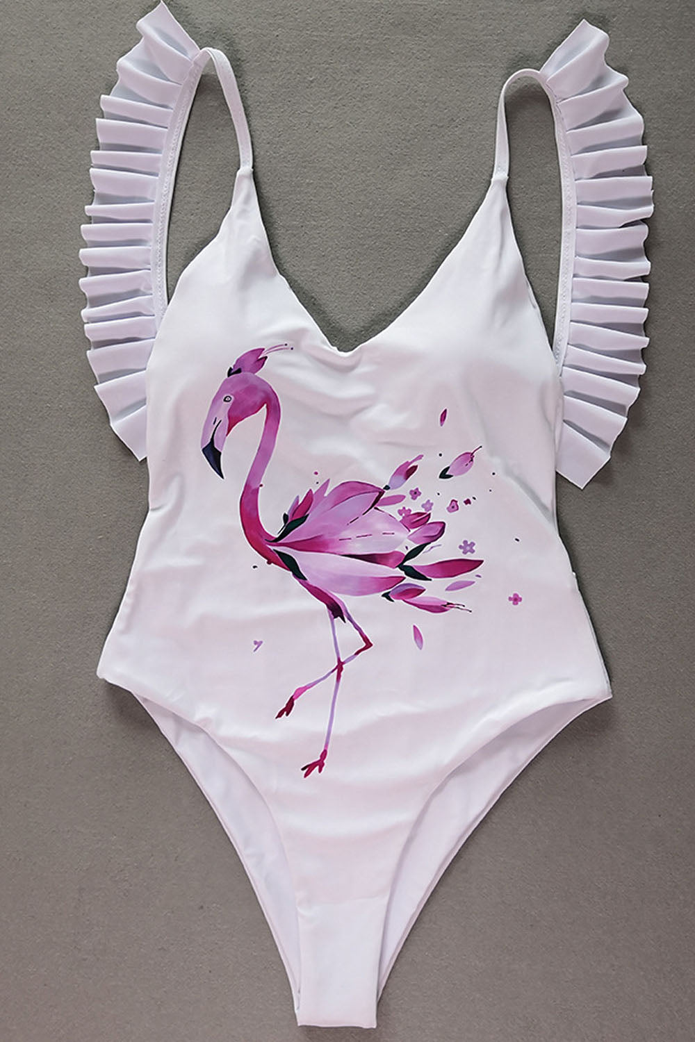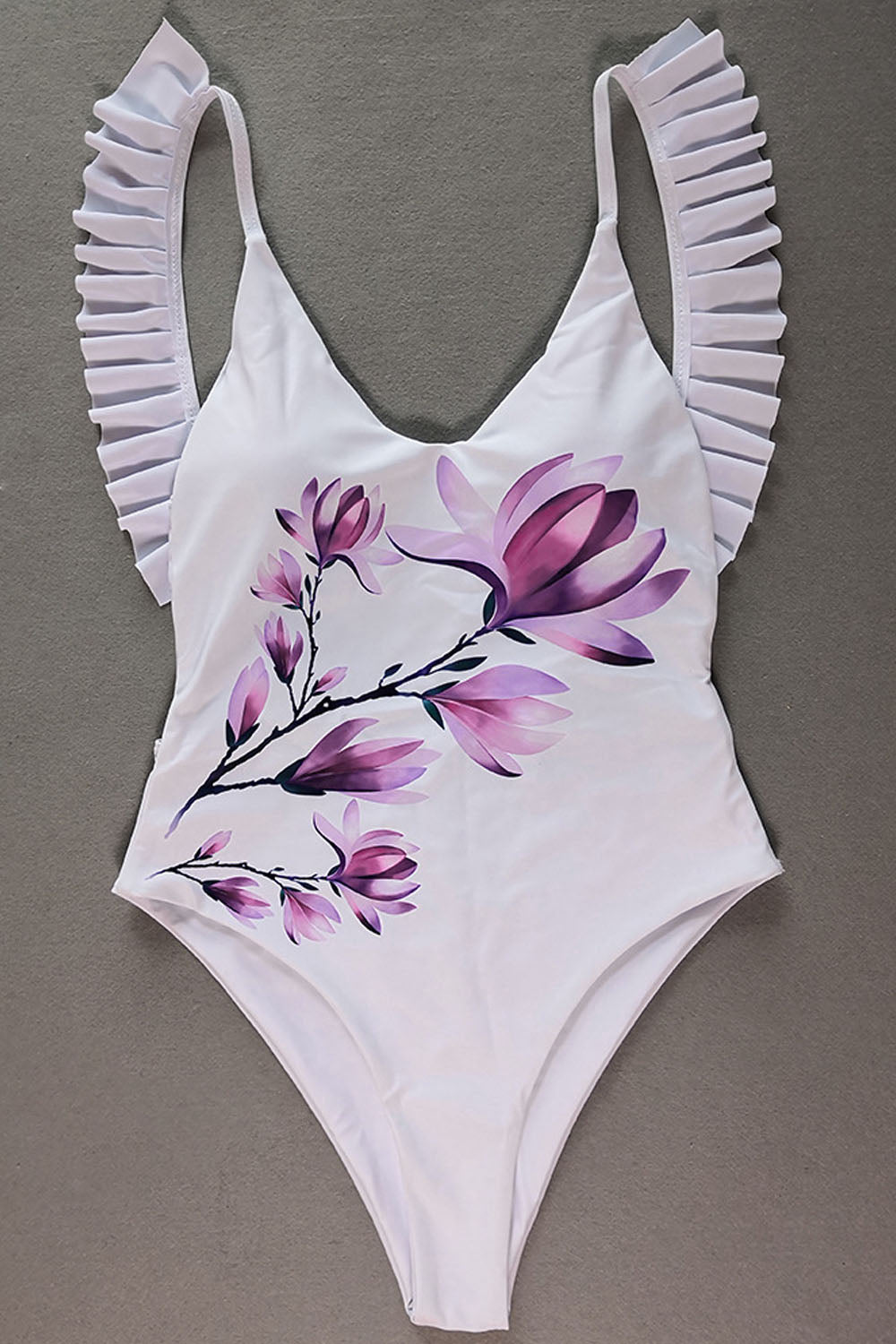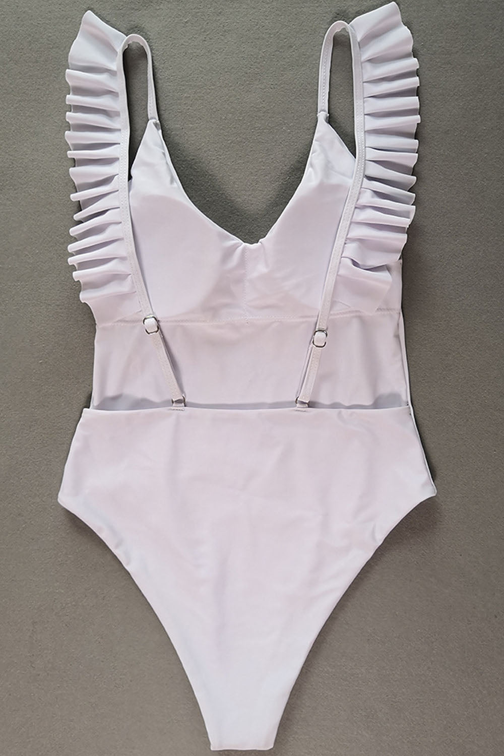 -White V-Neck Printed Shoulder Ruffle Trim Strap Backless Breathable Swimsuit.