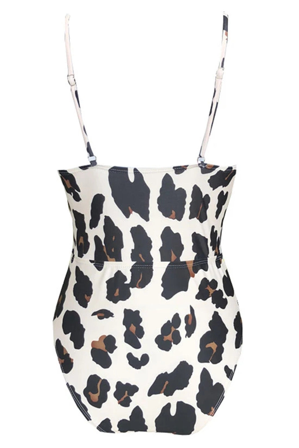 Sexy one piece swimsuit featuring notch trim on the front, underwire cups, adjustable shoulder straps, and brief-cut bottom. Allover in leopard printed.