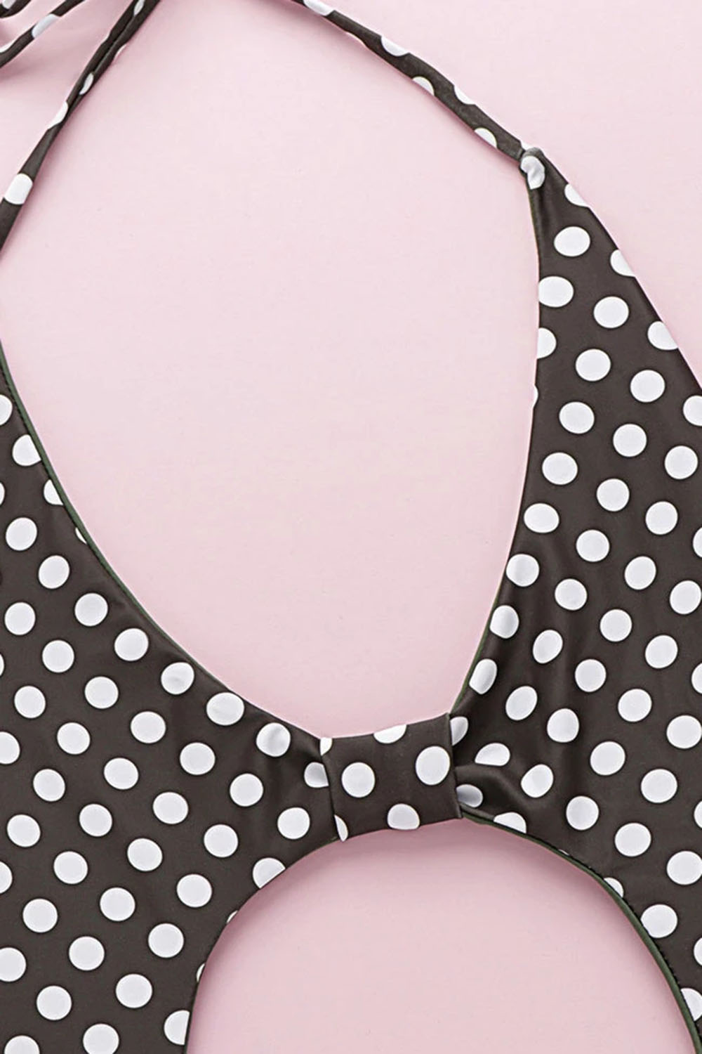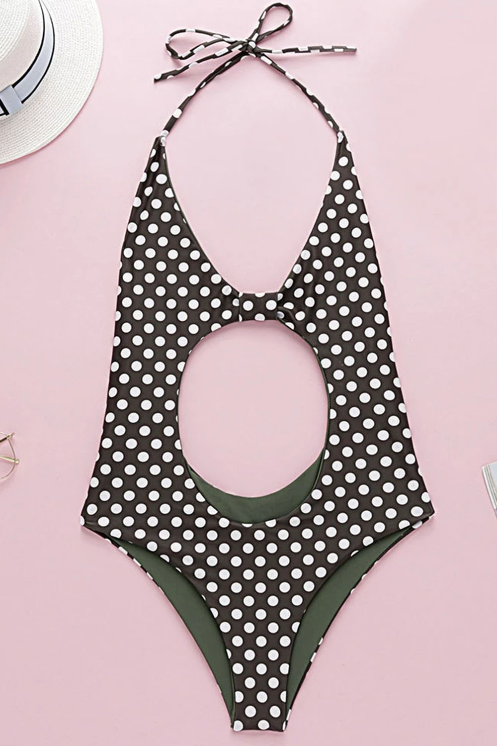 REVERSIBLE POLKA DOT LOW BACK CUTOUT HALTER ONE PIECE SWIMSUIT