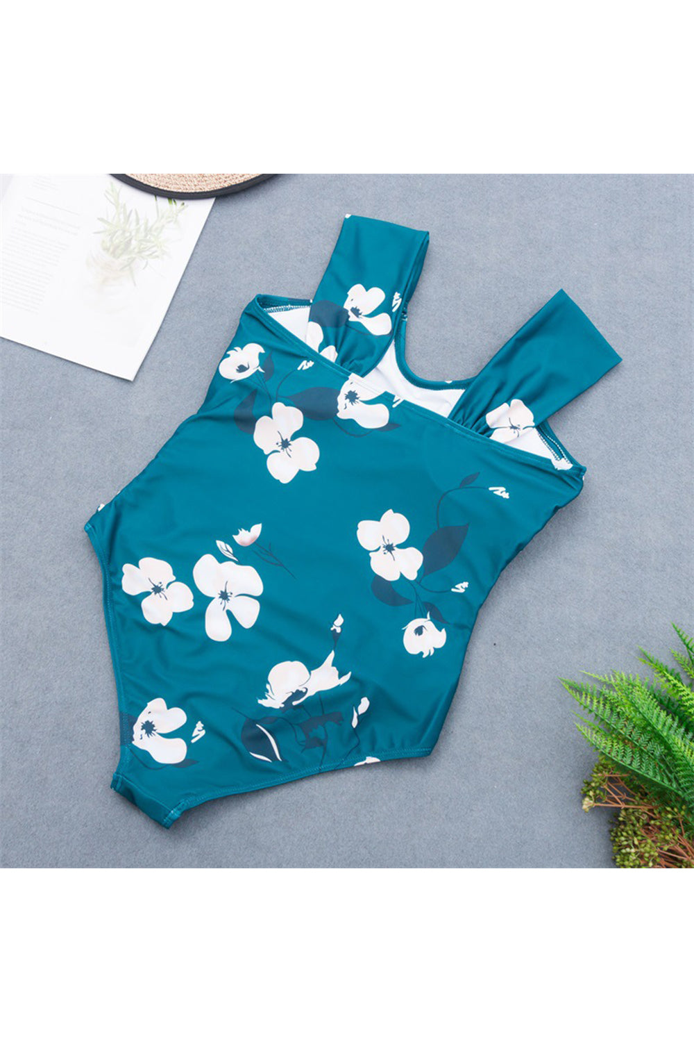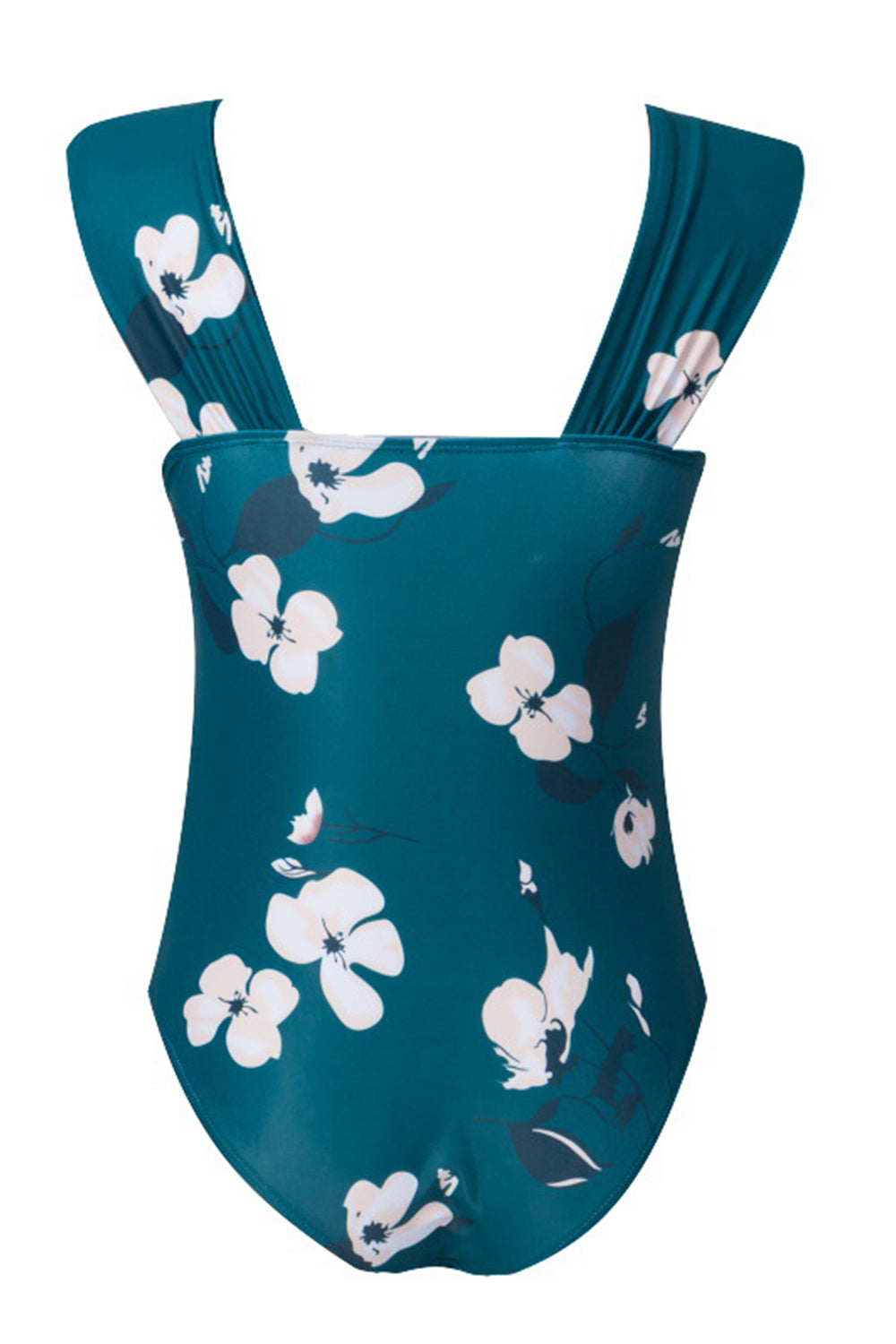 Girlish one piece swimsuit featuring square neckline, padded cups, suspender shoulder straps, ruched details, and brief-cut bottom. Allover in floral printed.