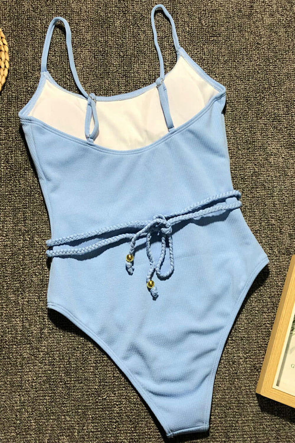 SOLID BRAIDED BELTED RIBBED ONE PIECE SWIMSUIT
